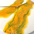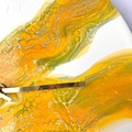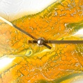 Det udtryksfulde vægur med det organiske unika-maleri i gul, grøn og guld er malet på LP'en "Clarinet Corcerto in A major" af Mozart, opført af Gervase de Peyer sammen med London Symphony Orchestra, dirigeret af Peter Maag.
