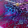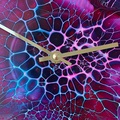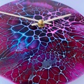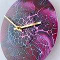 Det udtryksfulde vægur med det organiske unika-maleri i magenta og blå er malet på singlen "English Course, Lesson 30" fra The Linguaphone Institute. Smuk som lyn på en varm sommeraften.